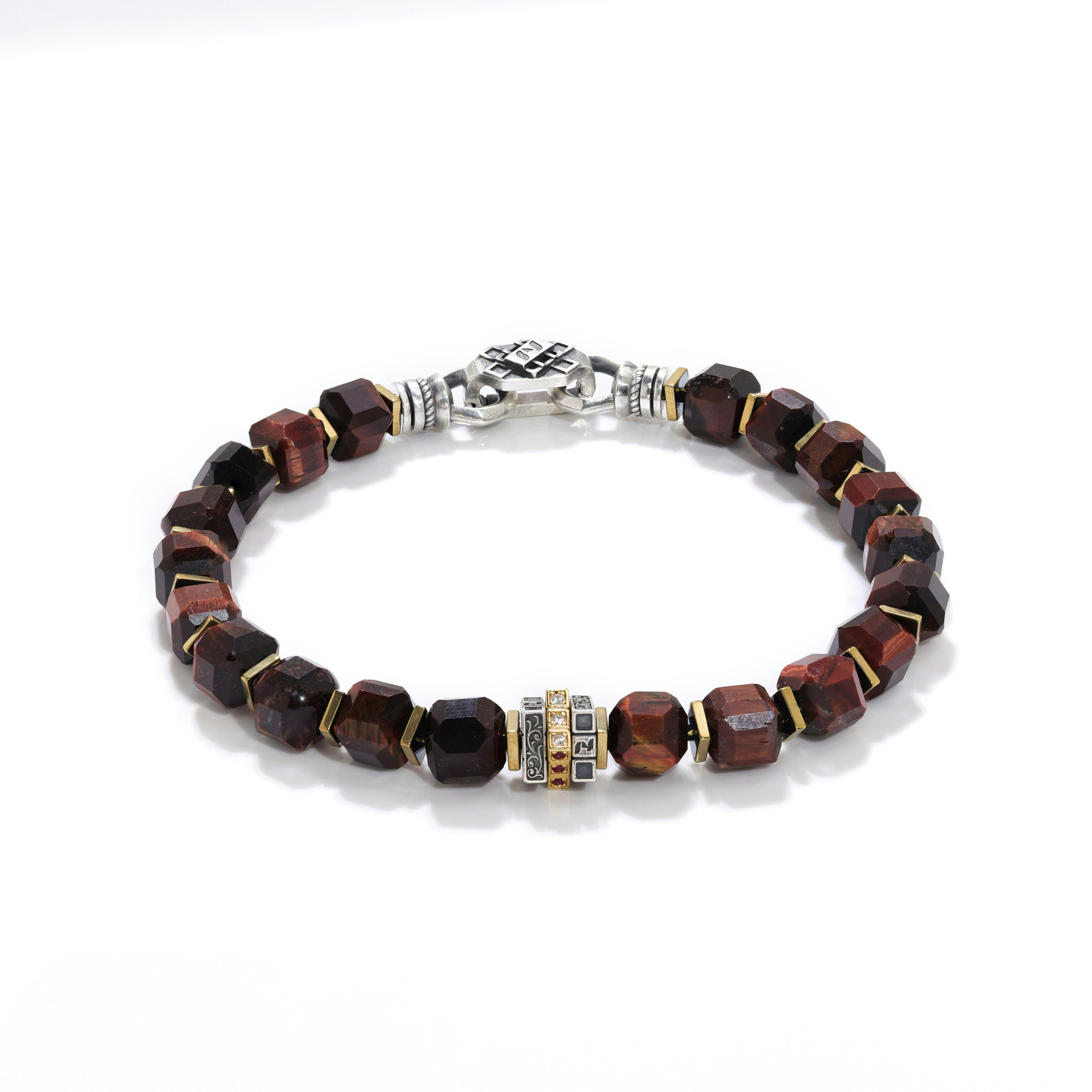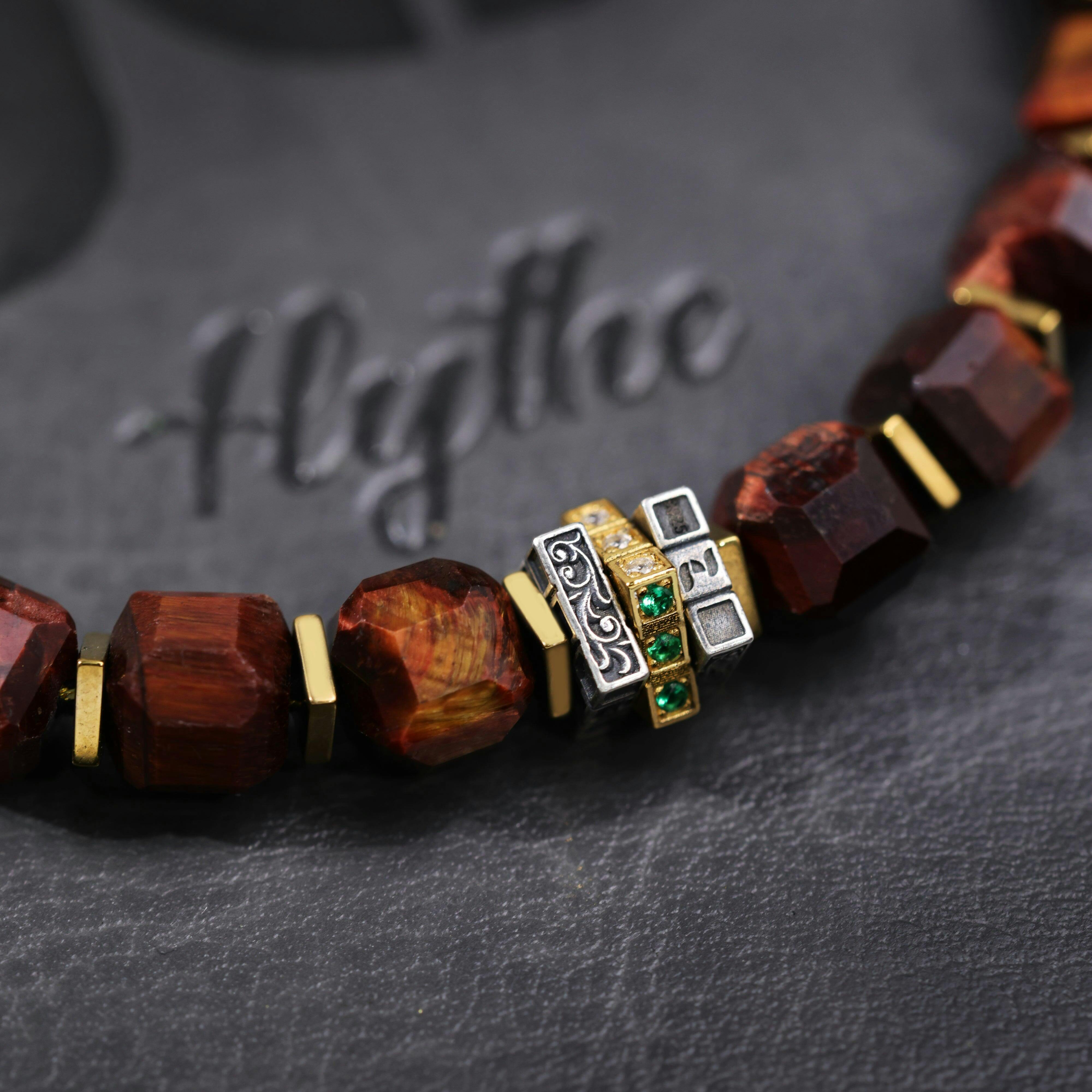 Discover our artisan-crafted bracelet, blending tribal totem aesthetics with modern luxury. Featuring faceted red tiger eye beads and an intricately engraved 18k gold vermeil clasp, it's a statement piece for any occasion.