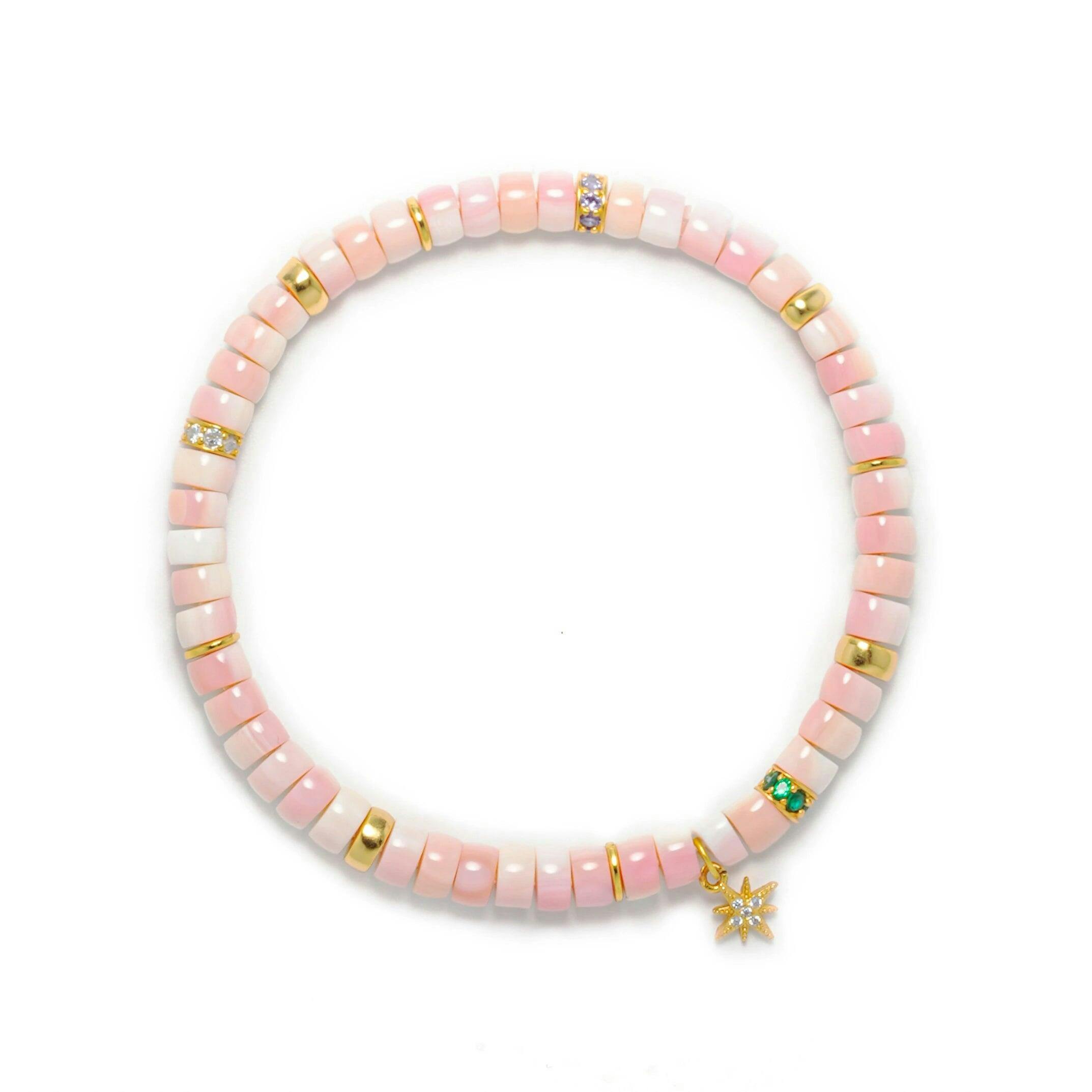 Discover delicate boho chic style with our Starlight bracelet. Featuring genuine pink mother of pearl and a celestial star charm, its stretch design offers effortless comfort for daily wear, stylish stacking, or as a meaningful gift.