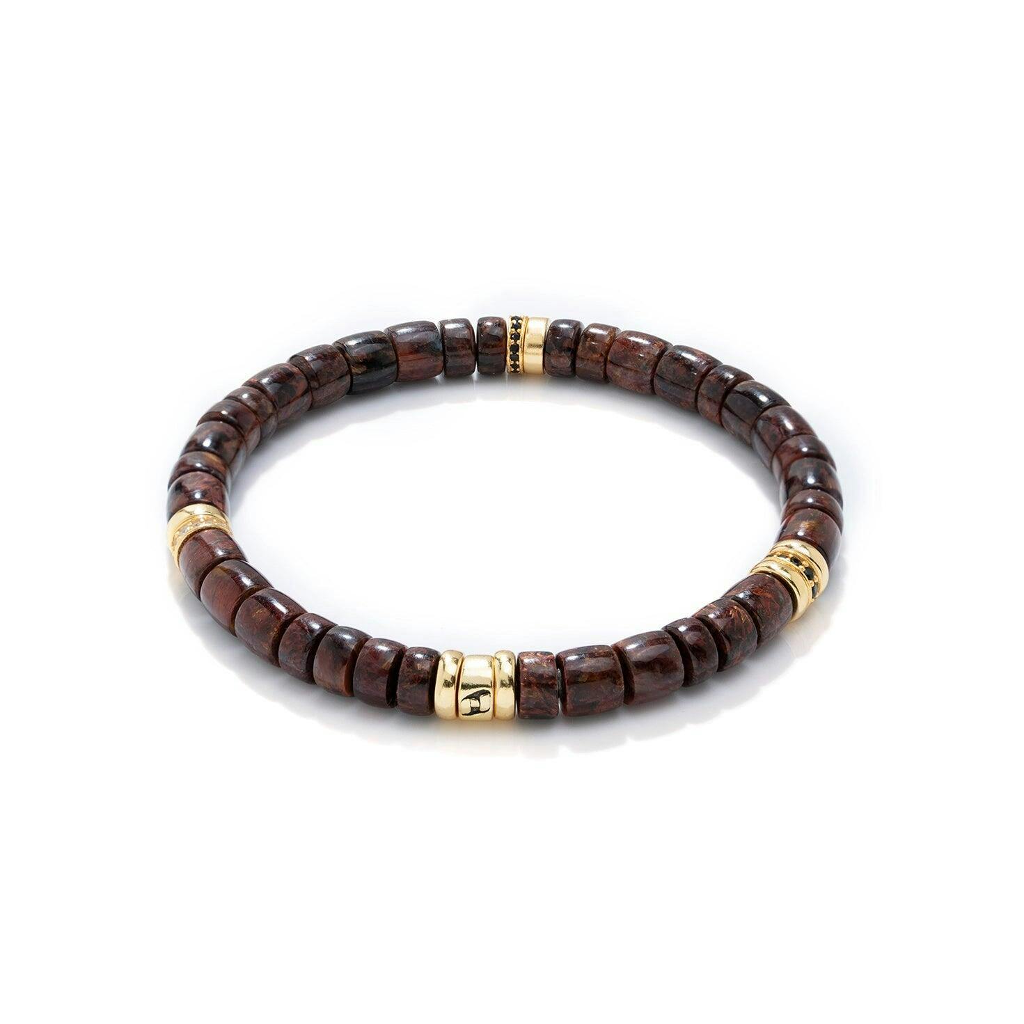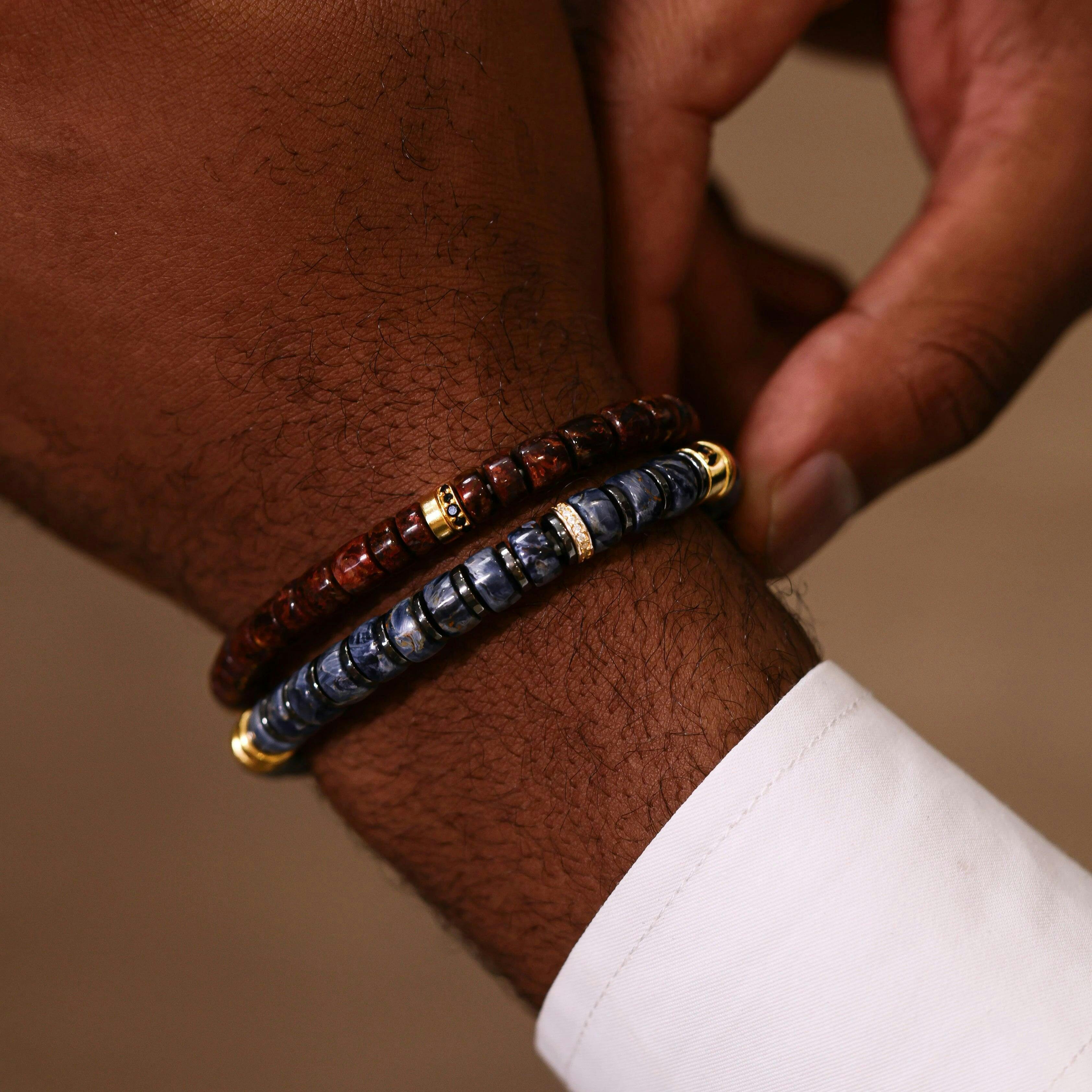 A designer stretch bracelet blending natural Pietersite with 18k Gold Vermeil. Its Tempest Stone pattern and micro-pave details offer a unique look for daily wear or stacking.